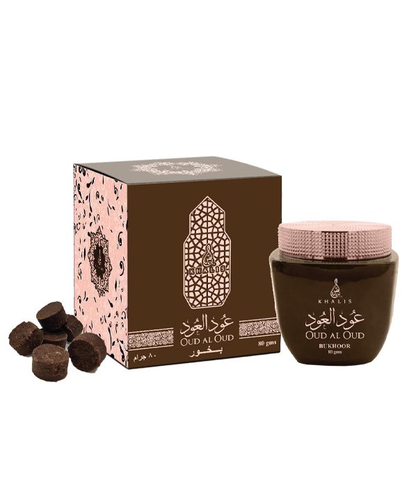 Bukhoor oud al oud 80 grms de Khalis, essence de oud authentique pour une expérience parfumée luxueuse.